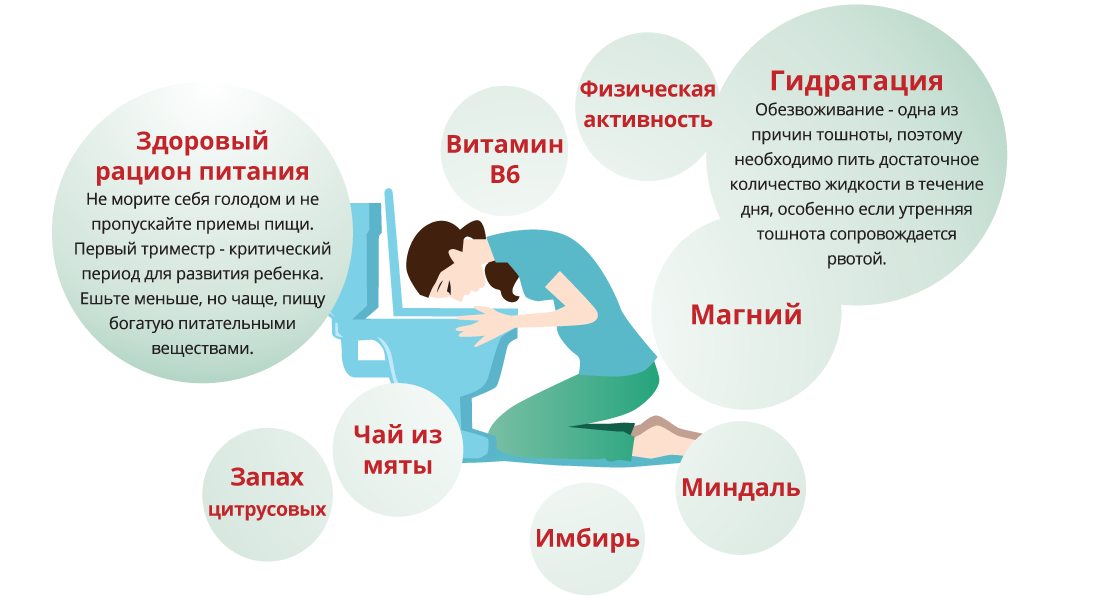 Утренняя тошнота — это первое, что у большинства женщин ассоциируется с началом беременности. Хотя они не считаются опасными, они крайне неприятны, особенно если сопровождаются рвотой или продолжаются весь день. Они возникают более чем у половины беременных женщин в первом триместре беременности, и считается, что гормональные изменения играют определенную роль в их возникновении. Пока не известно, как полностью предотвратить утреннюю тошноту, но избегание резких запахов, излишне приправленной блюд и пищи, богатой сахаром, а также достаточного отдыха, употребления таких продуктов, как имбирь и миндаль, определенных питательных веществ и достаточного потребления воды могут помочь.